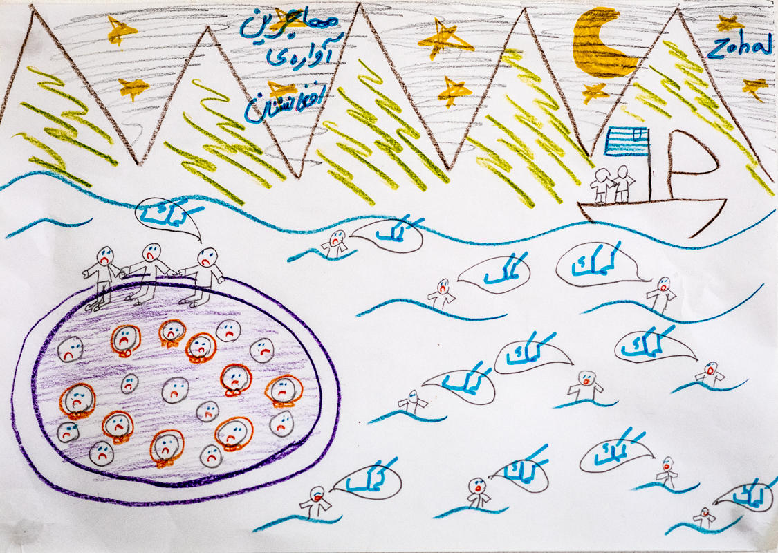Refugee child's drawing of drowning and rescue at sea, Athens