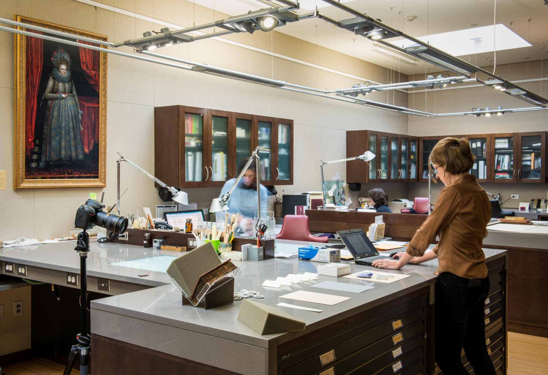 Preparing for DNA analysis of ancient vellum, Conservation Department, Folger Shakespeare Library