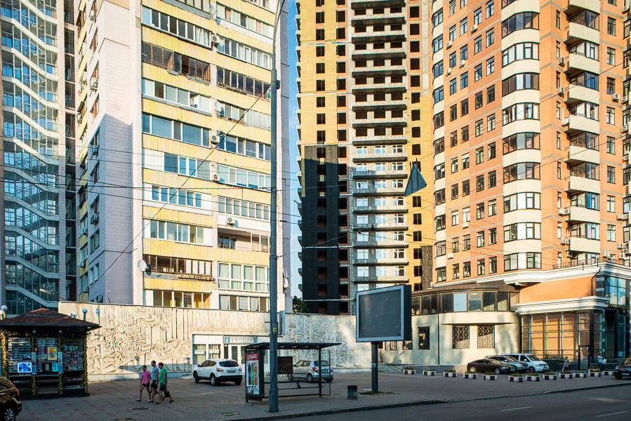 Soviet-era library in front of oligarch-built high-rise apartments, Kyiv, Ukraine, 2016